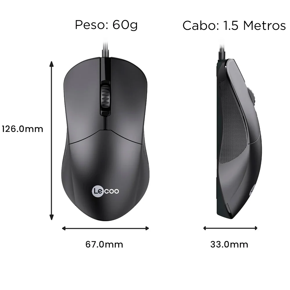 Mouse Com Fio USB Lenovo Lecoo M1102 – Simplicidade, Conforto e Precisão O Mouse Lenovo Lecoo M1102 é uma solução prática e eficiente para o uso diário, seja em casa, no escritório ou em estudos. Com um design ambidestro, ele foi projetado para oferecer conforto tanto para destros quanto para canhotos, adaptando-se a diferentes estilos de uso. A resolução de 1.200 DPI proporciona excelente precisão em movimentos, ideal para tarefas como navegação na internet, edição de documentos e trabalhos gráficos leves. Sua conexão USB plug and play garante fácil instalação, sem necessidade de configurações adicionais. Principais Características Resolução de 1.200 DPI:Oferece movimentos precisos e suaves em diversas superfícies. Conexão USB Plug and Play:Simples de instalar – basta conectar ao computador e começar a usar. Design Ambidestro:Conforto para todos os usuários, independentemente da mão dominante. Estrutura Leve e Ergonômica:Reduz o cansaço em longos períodos de uso, garantindo comodidade. Compatibilidade Universal:Funciona perfeitamente com Windows, macOS e Linux. Acabamento Preto Sofisticado:Combina com qualquer setup de trabalho ou estudo. Vantagens do Lenovo Lecoo M1102 Versatilidade Total:Ideal para uso doméstico, profissional ou acadêmico, com desempenho confiável em todas as situações. Durabilidade Comprovada:Fabricado com materiais resistentes, suportando o uso contínuo. Portabilidade Fácil:Compacto e leve, é perfeito para transportar em bolsas ou mochilas. Precisão e Agilidade:A alta resolução facilita a execução de tarefas com rapidez e eficiência. O Mouse Lenovo Lecoo M1102 combina funcionalidade, design confortável e desempenho confiável. Simplifique sua rotina com um periférico feito para atender às suas necessidades diárias, com praticidade e estilo! Especificações: Conexão: USB DPI: 1200 Tipo de Sensor: Óptico Quantidade de Botões: 3 Possui Scroll: Sim Ambidestro: Sim Tamanho: Médio Plug And Play: Sim Possui Iluminação: Não Comprimento do Cabo: 150cm Revestimento do Cabo: PVC Compatibilidade: Win 7/8/10, Macos x 10.05 e Acima Vida Útil do Botão: 1 Milhão de Cliques Corrente de Voltagem: Dc 5v / =100ma Altura da Embalagem: 14.1cm Largura Embalagem: 8.6cm Comprimento Embalagem: 4.2cm Peso Embalagem: 120g Part Number/SKU: M1102
