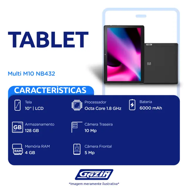 | Conteúdo da embalagem | 01 Tablet M10, 01 cabo USB tipo C, 01 case protetora, 01 fone de ouvido, 01 carregador e documentação. |