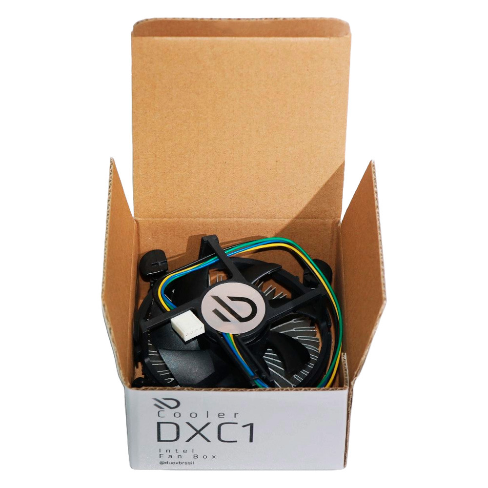 O Cooler Duex DX C1 Fan Box é a solução ideal para manter seu processador refrigerado. Compatível com soquetes Intel LGA 775/1150/1151/1155/1156, oferece um desempenho silencioso com 2500 RPM e fluxo de ar de 45-55 CFM. Com corpo de alumínio e centro de cobre, é leve (100g) e acompanha pasta térmica. Dimensões compactas: 10x11x7.5 cm.